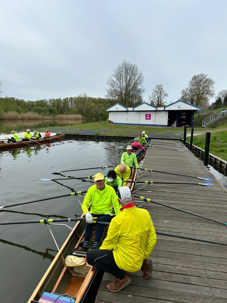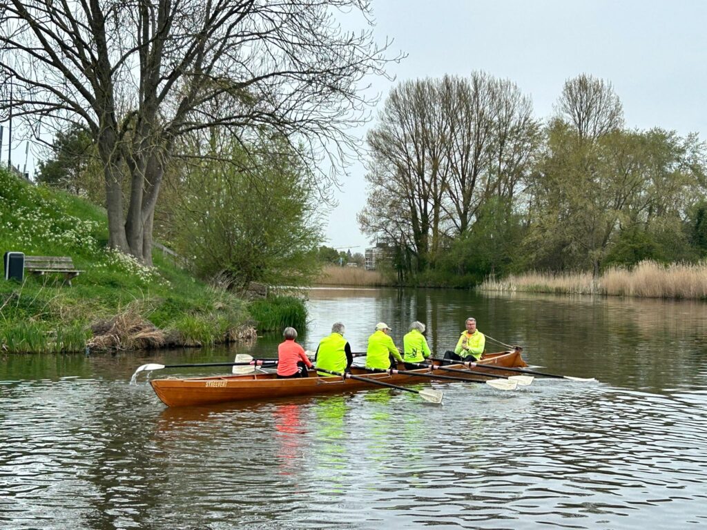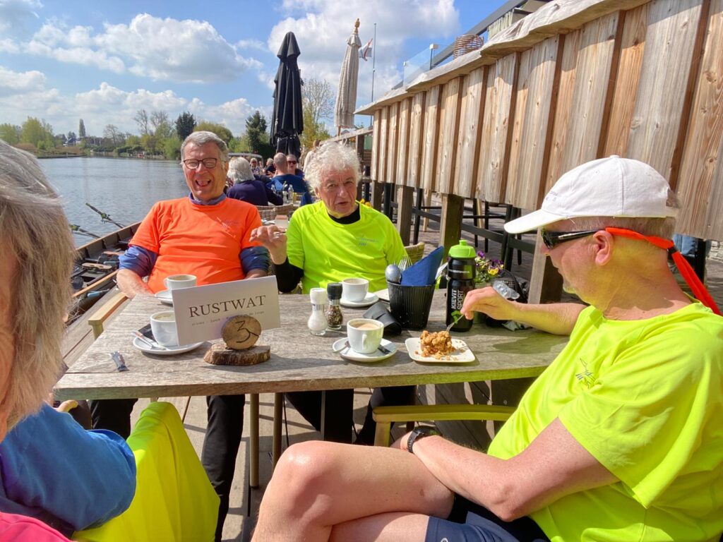 Om 11.00 uur werden we bij de Roeivereniging Leerdam met koffie en cake ontvangen. Het clubgebouw ligt op een dijk en de botenloods is beneden op de kade bij het water. Omdat we met 14 roeiers waren, werden we verdeeld over twee C4 boten en één C3 boot. Om 12.00 uur startten we in westelijke richting stroomafwaarts. Het traject was afwisselend, steeds bochtig en het roeide lekker omdat er praktisch geen scheepvaart is.