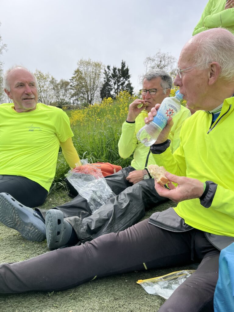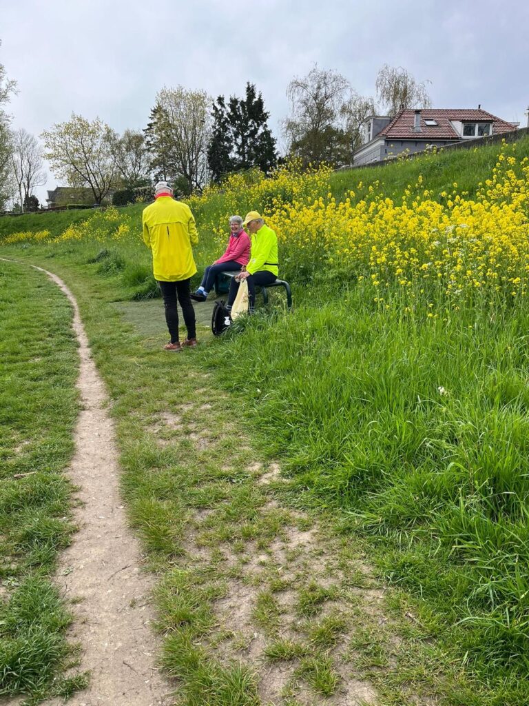 Nadat we ons gelaafd hadden werd de terugreis aanvaard. Onderweg zagen we hier en daar boomgaarden met bloeiende fruitbomen. Deze percelen waren meestal omzoomd door een beschermende haag, waar we (nu nog) doorheen konden kijken.