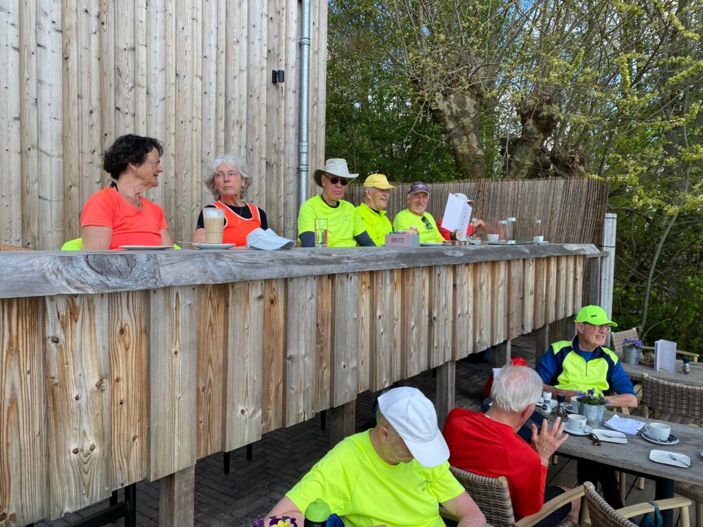 Eerst passeerden we de bebouwing van Leerdam met industriehaven maar daarna voeren we weer tussen de fraaie oevers met hier en daar treurwilgen met groen gekleurde neerhangende takken. Prachtig. We roeiden langs plaatsen als Asperen en Acquoy en bereikten onze eerste koffiestop. Dat was in Rhenoy. Het hier gelegen restaurant “Rustwat” lag aan het water en had een groot terras met lange kade, waar we mooi konden aanleggen. De koffie met appelgebak smaakte voortreffelijk en we zaten heerlijk in het zonnetje.